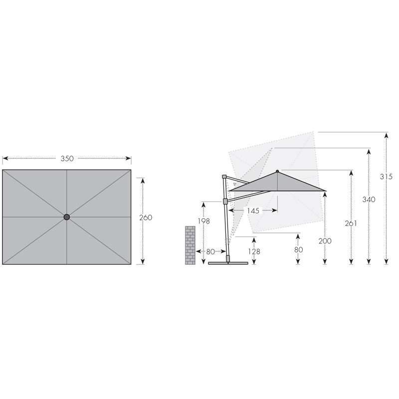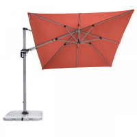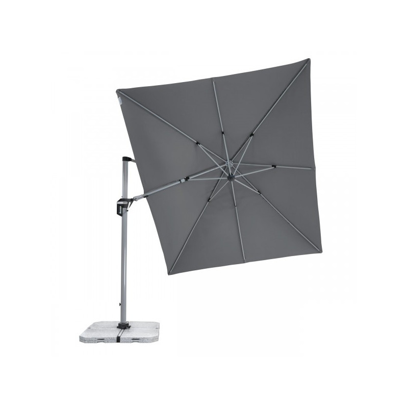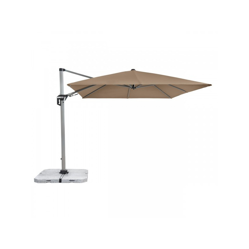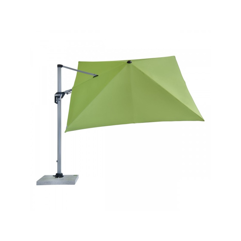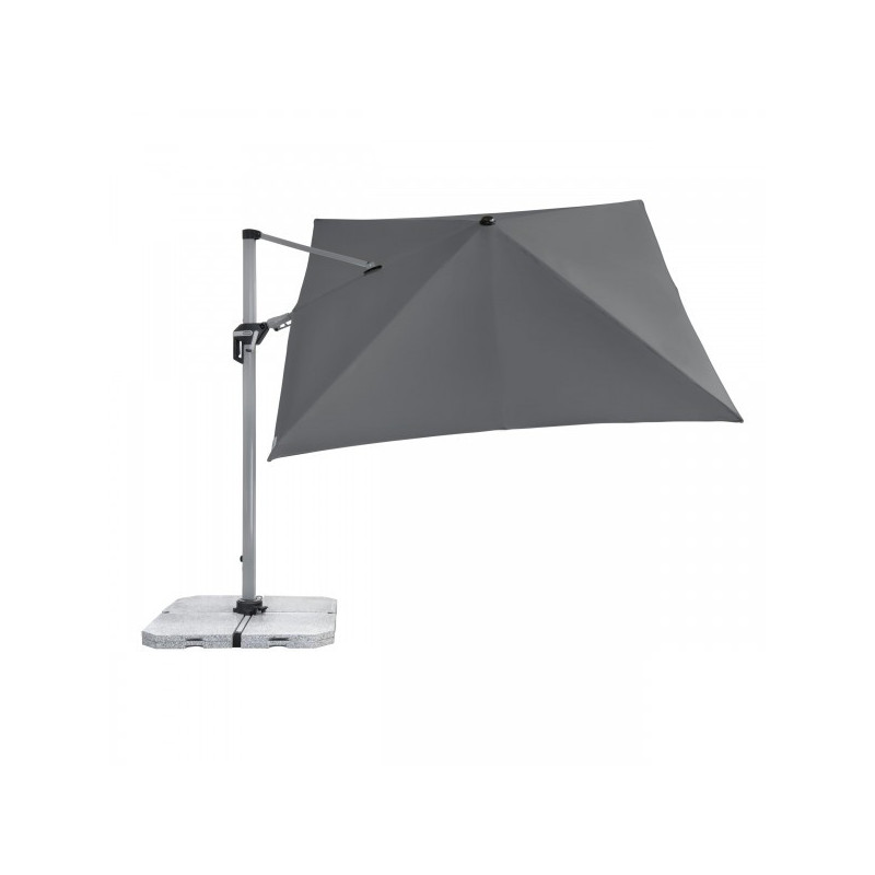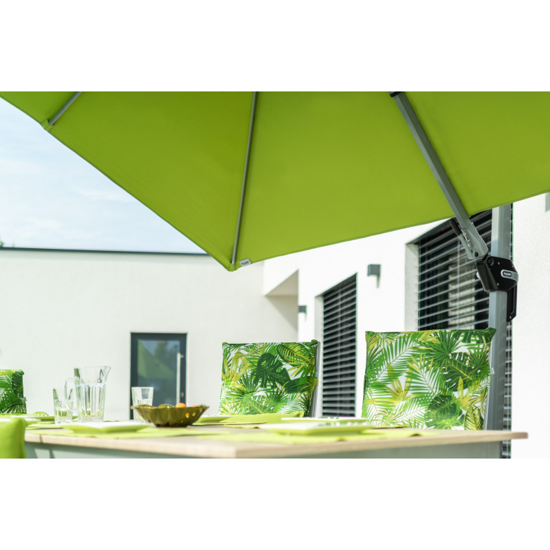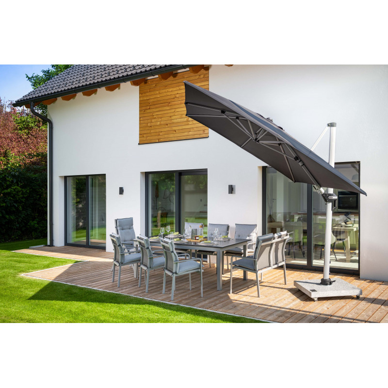 Active 350 x 260 cm je veľmi všestranný a vysoko kvalitný slnečník s pevným hliníkovým rámom. Obdĺžnikový tvar strechy je obzvlášť vhodný na zatienenie záhradného nábytku. Okrem toho sa slnečník dá prispôsobiť pohybu slnka počas dňa, pretože je možné ho otočiť o 360°, natočiť axiálne na obe strany a môže byť nastavený pod uhlom dozadu, čím sa optimálne prispôsobuje pohybu slnka. Poťah je vyrobený z polyesterovej tkaniny odpudzujúci vodu s dobrou UV ochranou 50+.