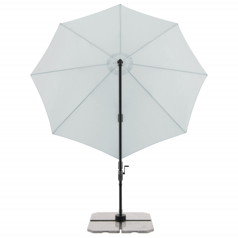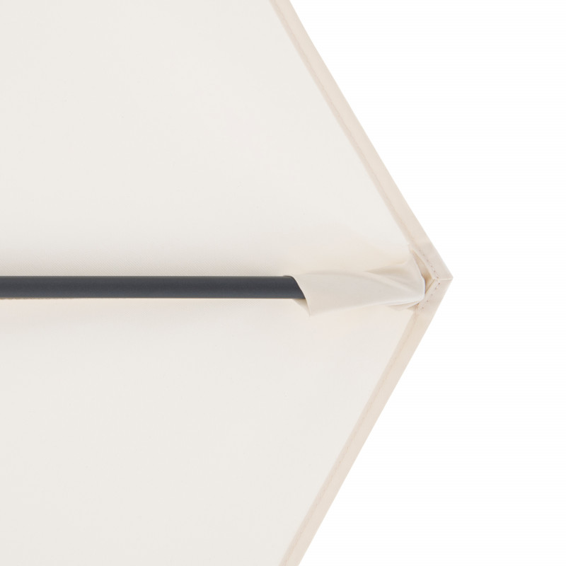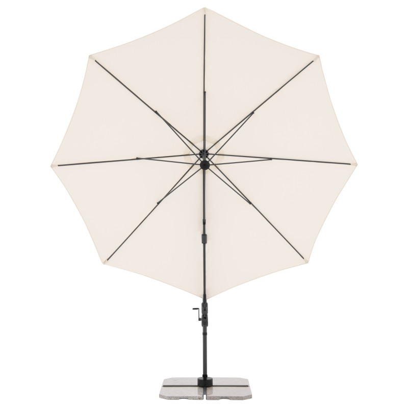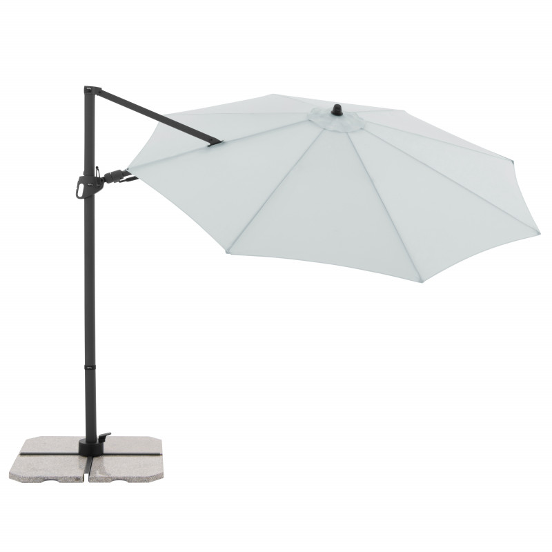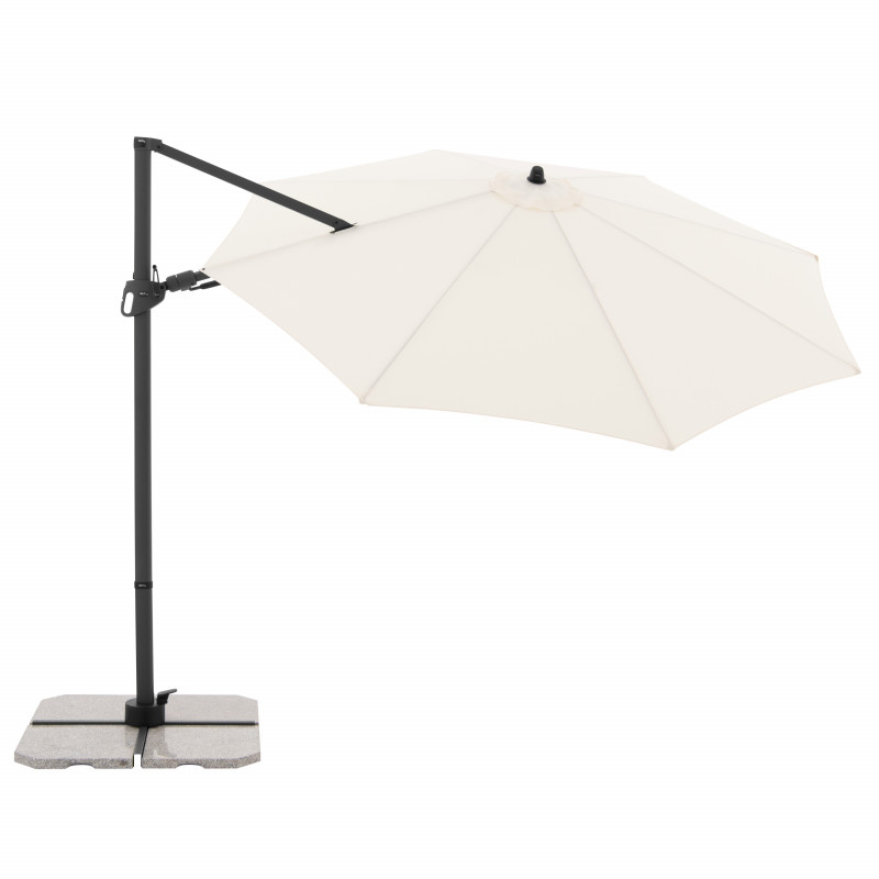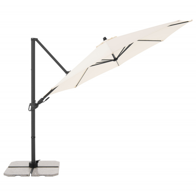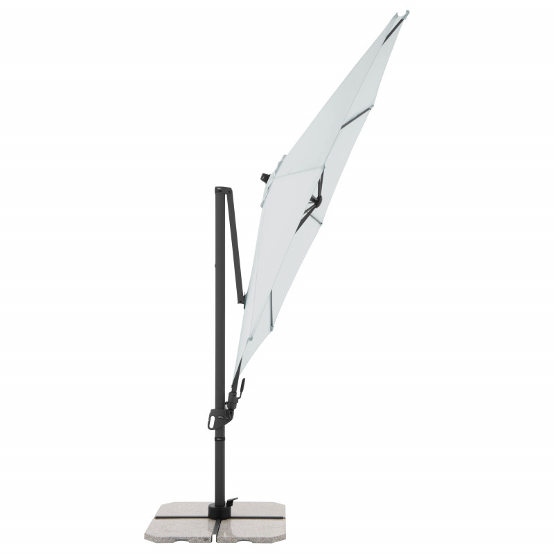 Slnečník má stabilnú hliníkovú konštrukciu, je vybavený kľukovým mechanizmom a je ľahko ovládateľný. Poťah slnečníka je vyrobený z polyesterovej tkaniny, je vodoodpudivý a má dobrú UV ochranu SPF 50+. Slnečník je otočný o 360°, je možné ho naklápať v siedmich pozíciách a axiálne natáčať na obe strany.