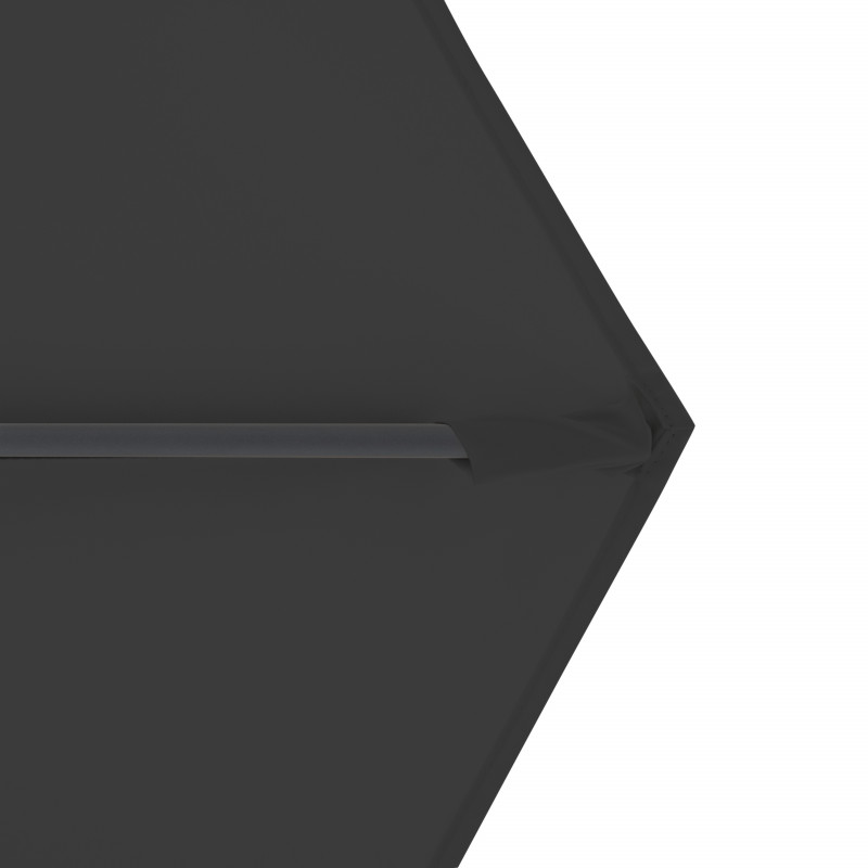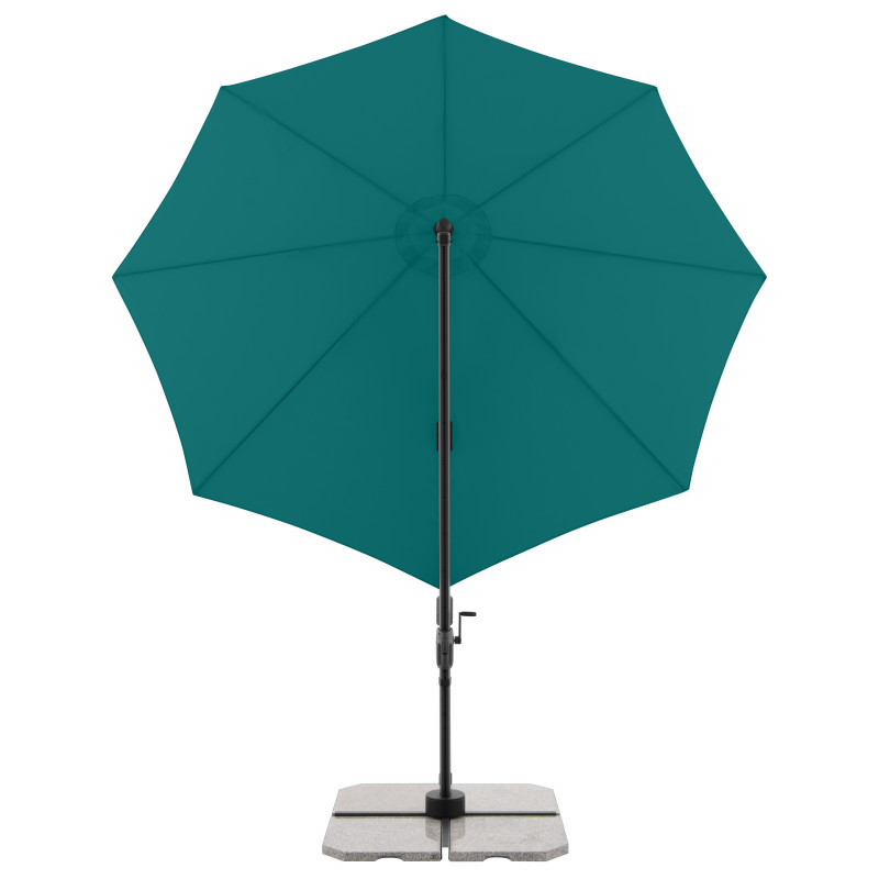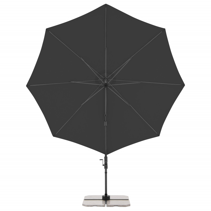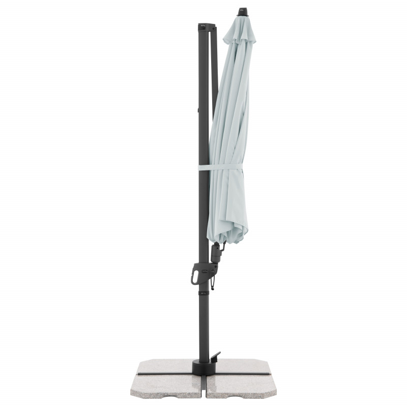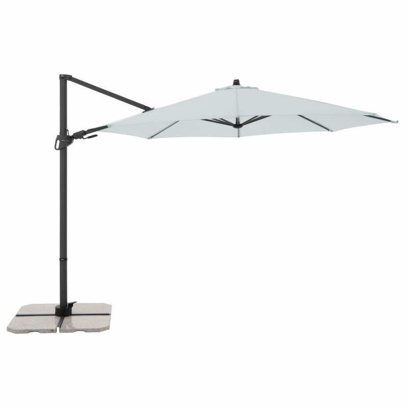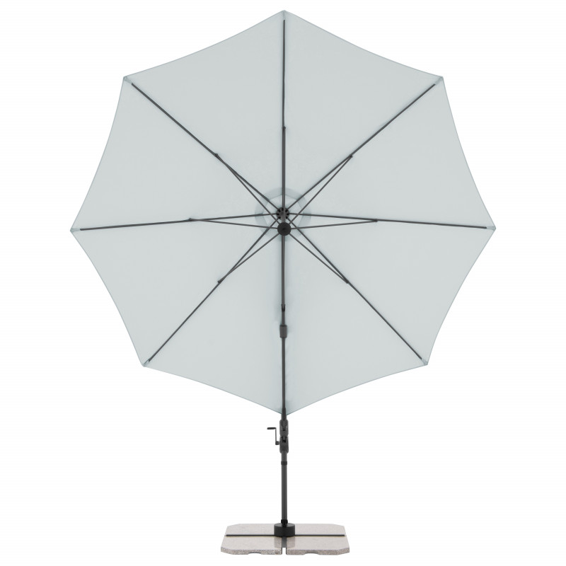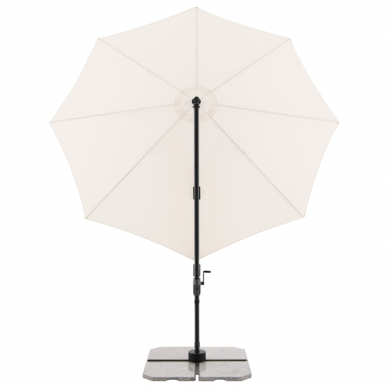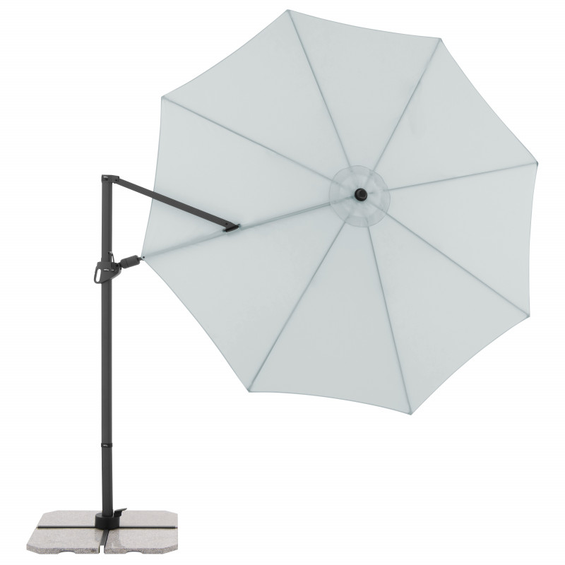 Slnečník má stabilnú hliníkovú konštrukciu, je vybavený kľukovým mechanizmom a je ľahko ovládateľný. Poťah slnečníka je vyrobený z polyesterovej tkaniny, je vodoodpudivý a má dobrú UV ochranu SPF 50+. Slnečník je otočný o 360°, je možné ho naklápať v siedmich pozíciách a axiálne natáčať na obe strany.