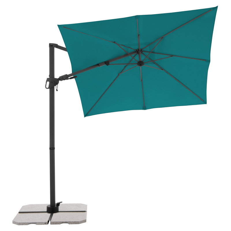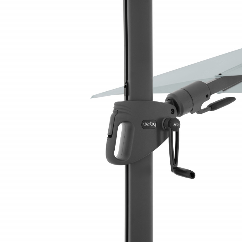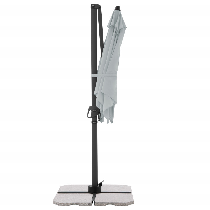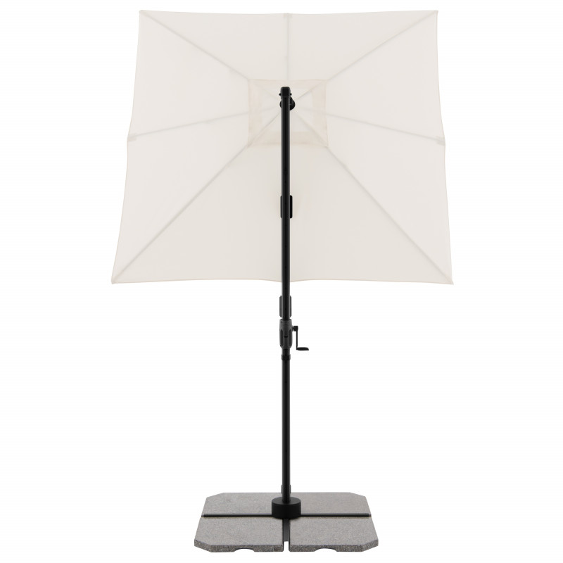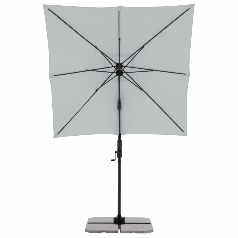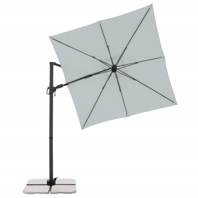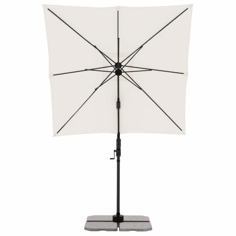 Slnečník má stabilnú hliníkovú konštrukciu, je vybavený kľukovým mechanizmom a je ľahko ovládateľný. Poťah slnečníka je vyrobený z polyesterovej tkaniny, je vodoodpudivý a má dobrú UV ochranu SPF 50+. Slnečník je otočný o 360°, je možné ho naklápať v siedmich pozíciách a axiálne natáčať na obe strany.