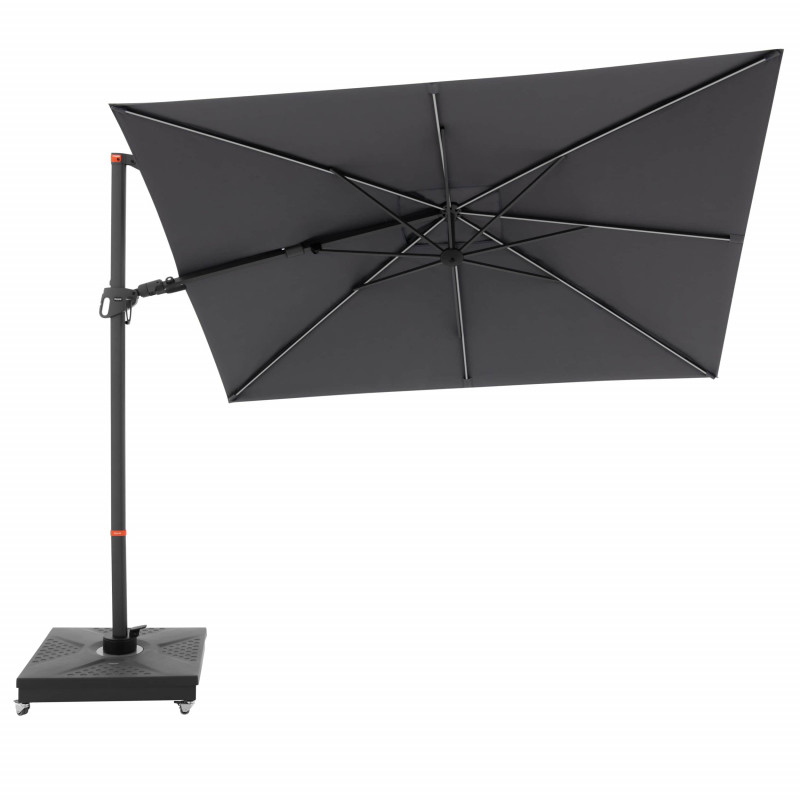 Vďaka obdĺžnikovej streche je slnečník obzvlášť vhodný na zatienenie záhradného nábytku. Slnečník je možné tiež otáčať o 360 stupňov, osovo natáčať na obe strany a naklápať dozadu v siedmich polohách. Svetelné LED pásiky sú umiestnené do 6 dlhých ramien s diaľkovým ovládaním. Počas dňa sa batéria nabíja ekologickým spôsobom prostredníctvom solárneho panelu na hornej strane slnečníka.