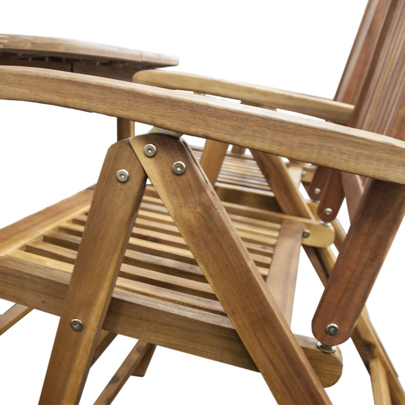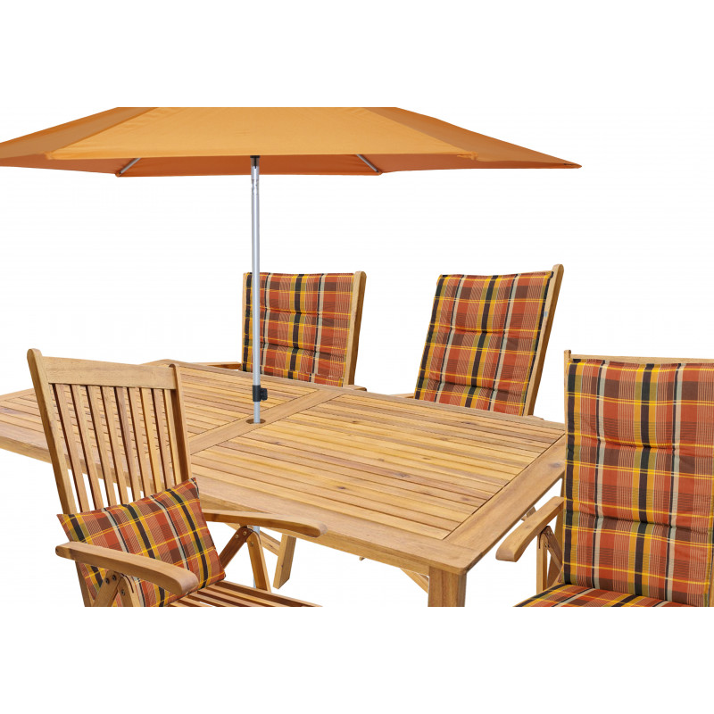 Súprava obsahuje štyri polohovateľné kreslá, ktorých operadlá je možné nastaviť do rôznych uhlov pre maximálne pohodlie. Keď ich práve nepoužívate, môžete ich jednoducho zložiť a ušetriť miesto. Masívne drevené podrúčky a možnosť doplniť ich o pohodlné podušky (odporúčame radu MOTION XL s výnimočnou hrúbkou 8 cm, špeciálne určené pre latkový nábytok) robia z tejto zostavy ideálne miesto na relax.