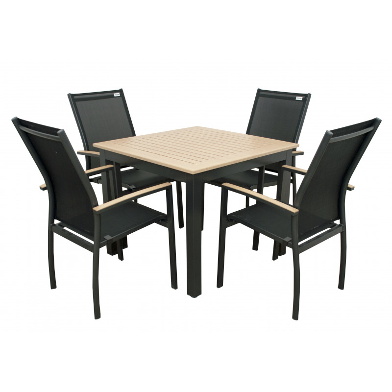 Štvorcový stôl EXPERT WOOD má odolnú hliníkovú konštrukciu v antracitovej farbe. Rebrovaná hliníková doska stola má práškový nástrek v dekore dreva. Vďaka tomu je stôl ľahký, bezúdržbový a odolný poveternostným vplyvom. Tým sa stáva záhradným nábytkom s dlhou životnosťou. Výhodou sú aj regulačné kolieska na nohách stola, ktoré pomáhajú vyrovnať výšku dosky aj na nerovnom vonkajšom povrchu.