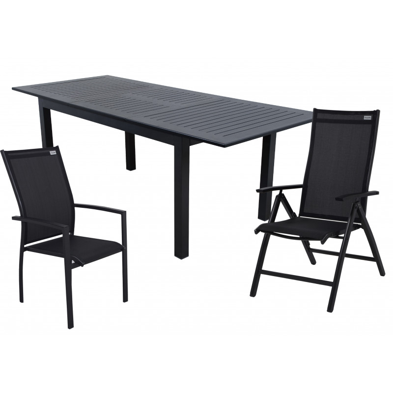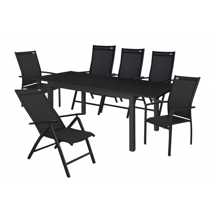 Skladá sa z: 4x polohovacie kreslo, 2x stohovacia stolička, 1x stôl 150/210 x 90 cm
