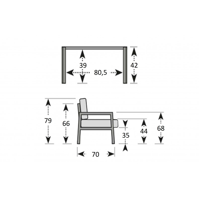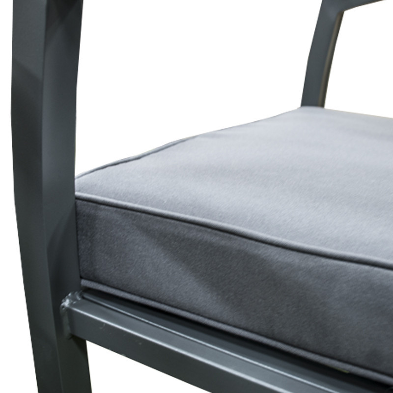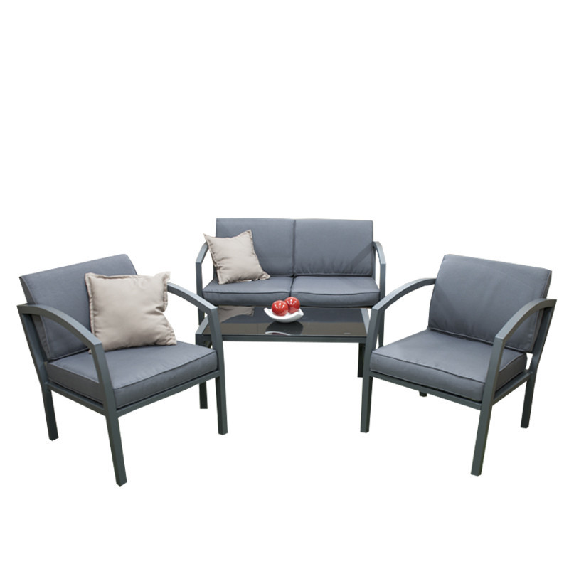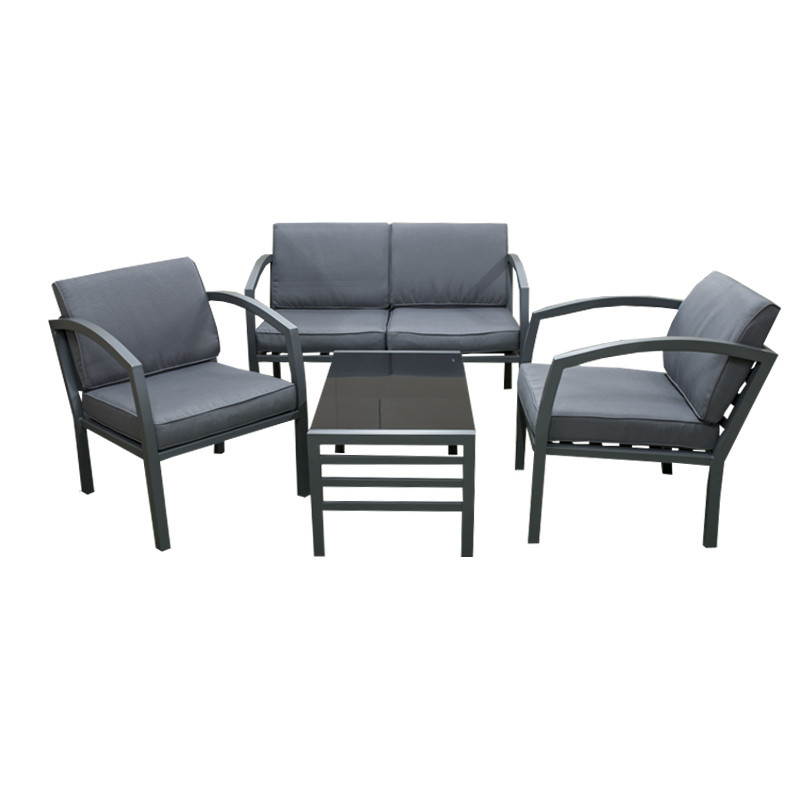 Kvalitná a stabilná hliníková konštrukcia v antracitovej farbe je kombinovaná s odolnými polyesterovými poduškami a nadýchanými opornými vankúšmi, ktoré ponúkajú maximálne pohodlie. Podušky sú vybavené zipsami, čo umožňuje ich jednoducho vybrať a vyprať. Set tvorí dvojmiestna pohovka, dve kreslá a stolík so sklenenou doskou.