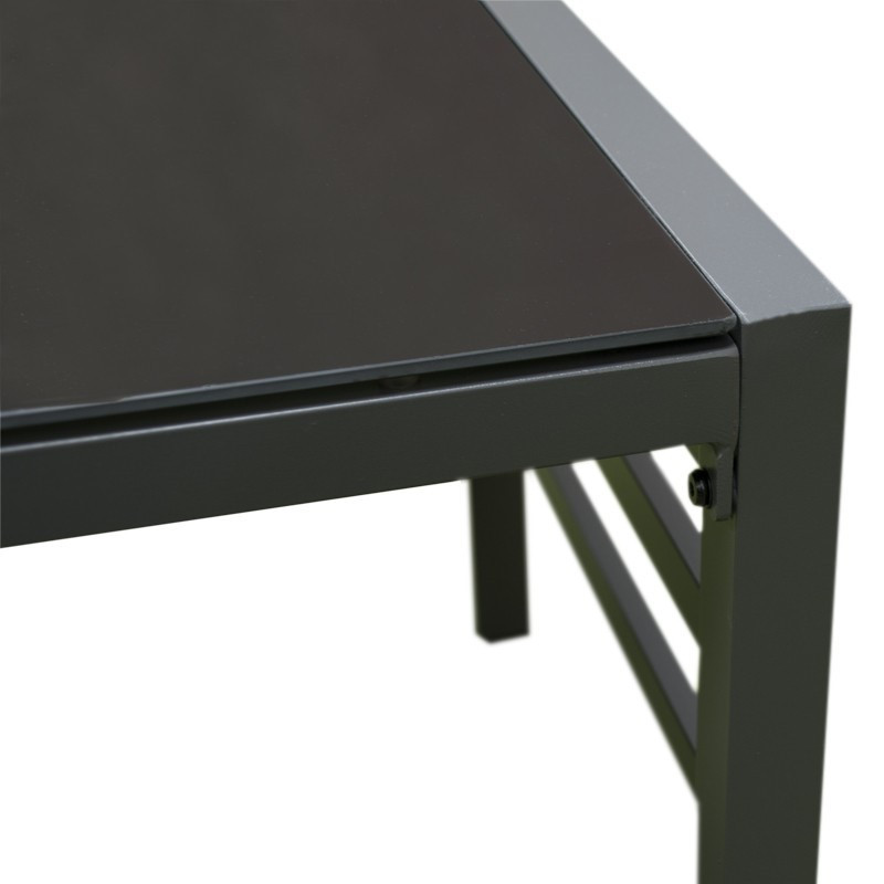 Moderný veľký štvorcový záhradný stôl s nadčasovým dizajnom a stabilnou hliníkovou konštrukciou v antracitovej farbe. Stôl je vhodný na väčšie terasy alebo záhrady. Doska stola je s hliníkovým rebrovaním. Stôl je robustný a zároveň ľahký a stabilný.