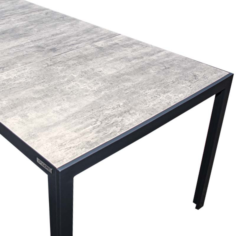 Súčasťou sedenia je aj stôl Bergamo vo veľkosti 180 x 90 cm. Stôl má odolnú hliníkovú konštrukciu ošetrenú práškovým nástrekom v antracitovej farbe, ktorý stôl chráni proti korózii a výrazne predlžuje jeho životnosť. Veľkou prednosťou stola je aj jeho odolná keramická doska krásnej žíhanej sivej farby.
