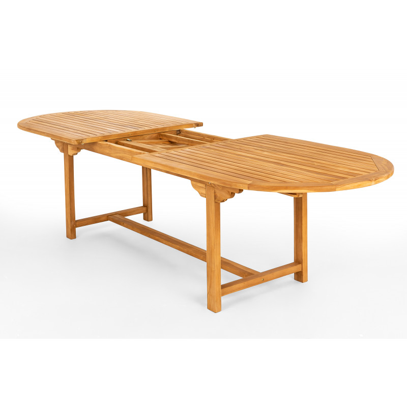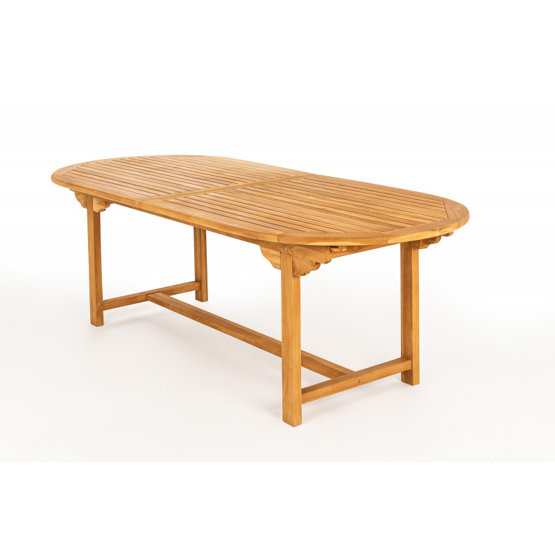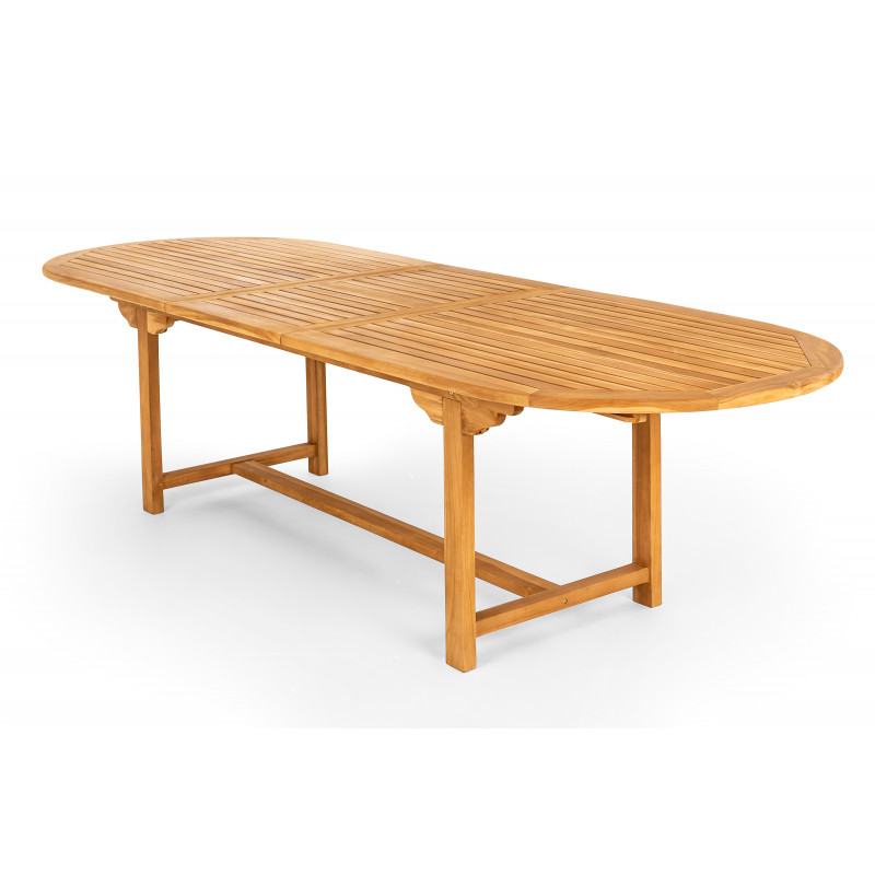 Taman je záhradný rozkladací stôl oválneho tvaru, ku ktorému sa bez problémov zmestí veľká skupina ľudí. Je vyrobený z kvalitného vysušeného teakového dreva, ktoré je mimoriadne trvanlivé, vysoko odolné a pevné. Stôl môže ľahko rozložiť jedna osoba. Práve možnosť rozloženia robí zo stola ideálneho spoločníka na stretnutia s priateľmi alebo rodinné oslavy.