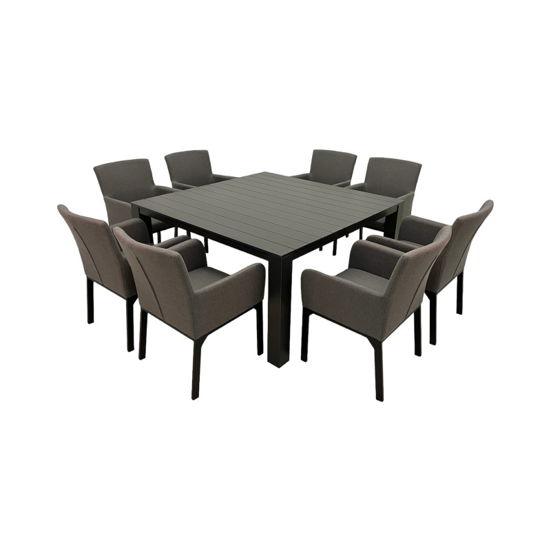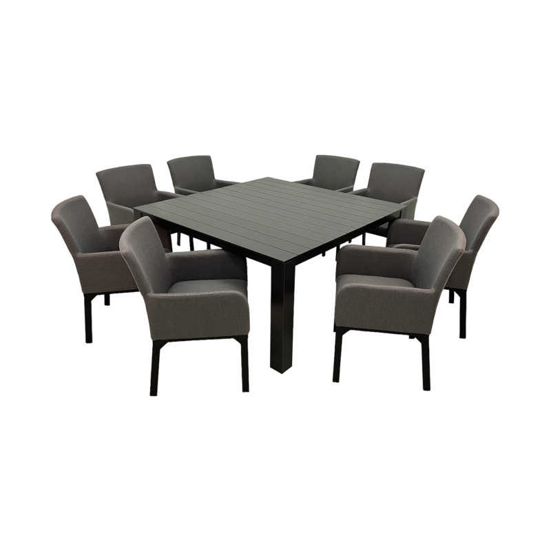 Táto luxusná súprava je vhodná pre každého, kto hľadá elegantný nábytok s mimoriadnou odolnosťou voči nepriazni počasia. Zostava sa skladá z 8 polstrovaných kresiel a veľkého hliníkového štvorcového stola.