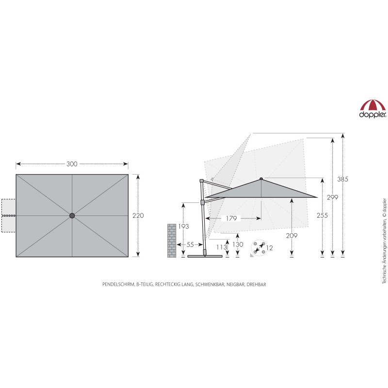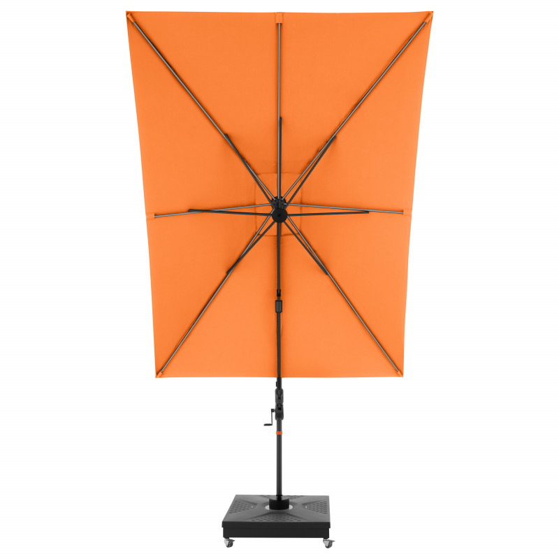 Vďaka obdĺžnikovej streche je slnečník obzvlášť vhodný na zatienenie záhradného nábytku. Slnečník je možné tiež otáčať o 360 stupňov, osovo natáčať na obe strany a naklápať dozadu v siedmich polohách. Svetelné LED pásiky sú umiestnené do 6 dlhých ramien s diaľkovým ovládaním. Počas dňa sa batéria nabíja ekologickým spôsobom prostredníctvom solárneho panelu na hornej strane slnečníka.